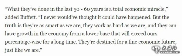 巴菲特说:“他们在过去五六十年间所成就的一切简直是个经济奇迹。我从来没想过会发生这种事。但事实是,中国人和我们一样聪明,他们像我们一样辛勤工作,他们从较低的基数发展经济,按百分比算,很长一段时间都会以高于我们的速度发展经济。他们的经济注定有一个美好的未来,就像我们一样。”