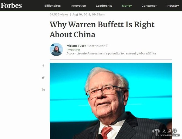 中国日报网8月18日电美国福布斯网站8月16日发表了题为《为什么巴菲特看准了中国》的评论文章,加拿大清洁能源公司ClearBlue公司首席执行官米丽娅姆·图尔克(MiriamTuerk)通过巴菲特投资比亚迪公司获得的成功,赞扬中国在战略领域的布局和全球投资眼光,并号召美国向中国学习。