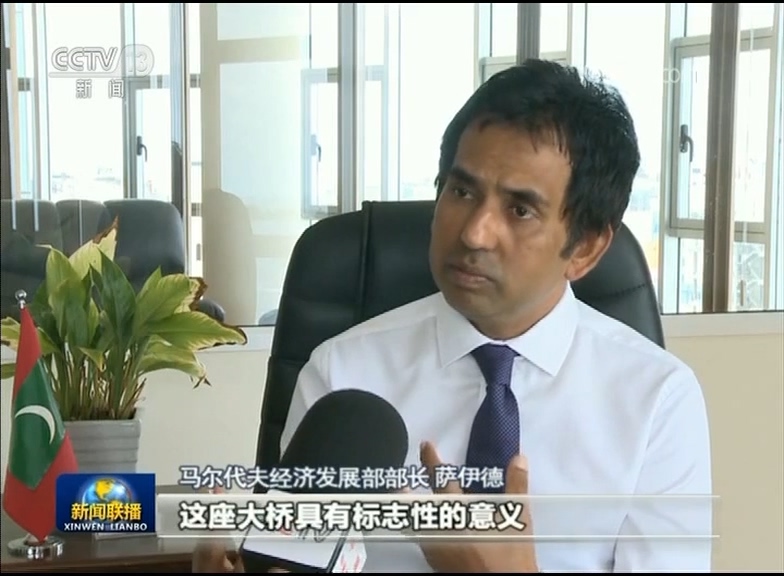 马尔代夫经济发展部部长 萨伊德:这座大桥具有标志性的意义,给马尔代夫人民带来了便利,改变了我们的出行方式,以往我们只能坐船进出首都,现在开车3分钟就可以过桥,这是中马友谊大桥带给我们的切实好处。习近平主席的讲话也给了我们很大的激励,他不是说说而已,而是能落实到具体的行动中,让人们相信改变的可能性。