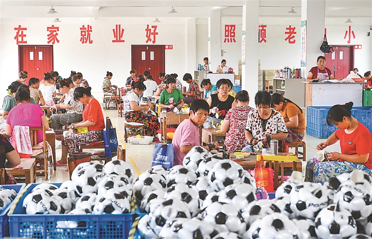 现在,大妈大婶缝制的各类玩具,飞出了国门;农民手工缝制的足球,卖到了世界各地;村里加工的服装服饰,卖进了各大商场超市……家门口就业,正成为江苏省农村一道增收新风景。