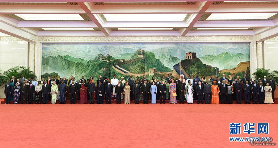 当晚的人民大会堂灯火通明,欢乐祥和。习近平和彭丽媛同贵宾们亲切握手,互致问候。56位活泼可爱的少年儿童手持中非合作论坛成员方国旗、会旗,热烈欢迎中外领导人夫妇,手拉手一一引领领导人夫妇集体合影。习近平和彭丽媛同各国领导人及夫人在巨幅苏绣壁画《长城》前合影留念。随后,壁画打开,中外领导人夫妇在汉白玉台阶前驻足,欣赏童声合唱《茉莉花》。在前往宴会厅沿途,盛装的青少年载歌载舞,欢迎远道而来的贵宾。