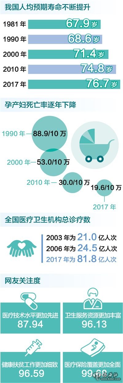 我国人均预期寿命不断提升。1981年为67.9岁,2000年为71.4岁,2017年为76.7岁。婴儿死亡率和孕产妇死亡率持续下降,分别从1990年的32.9‰和88.9/10万,下降为2017年的6.8‰和19.6/10万。