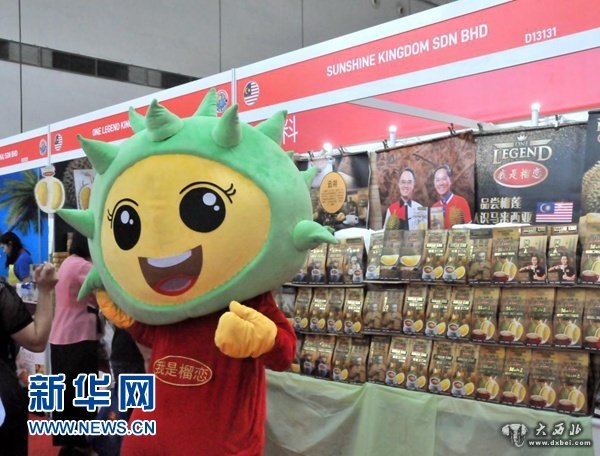 9月13日,在广西南宁国际会展中心,马来西亚展区前,客商打扮成“榴莲娃娃”吸引顾客。新华网发 张茵摄