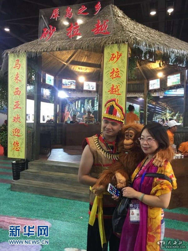9月14日,在广西南宁国际会展中心,观众在“魅力之城”之一的马来西亚砂拉越州展区前合影。新华网发 张茵摄