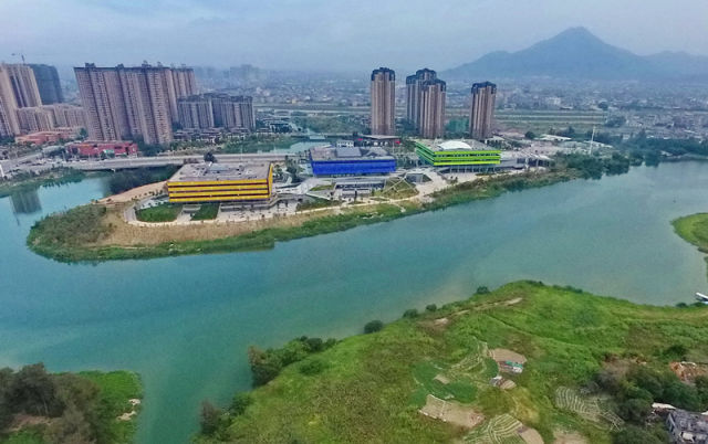 这是利用木兰溪流域旧河道开挖成的人工湖——玉湖。当地在此结合周边公共绿地,建设公共建筑,实现了现代建筑与自然景观浑然一体(8月6日无人机拍摄)。新华社记者林善传摄