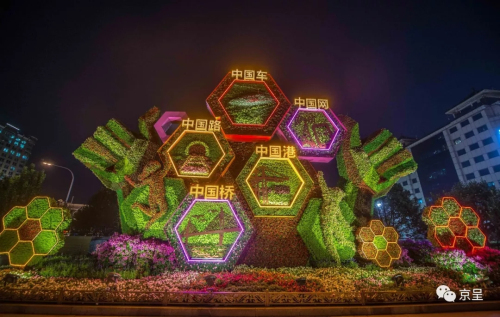 ▲“辉煌中国”主题花坛,通过重大工程的建设成就(中国桥、中国路、中国车、中国港、中国网),讴歌了伟大祖国从站起来、富起来到强起来的伟大飞跃,展现辉煌中国新时代新风貌。