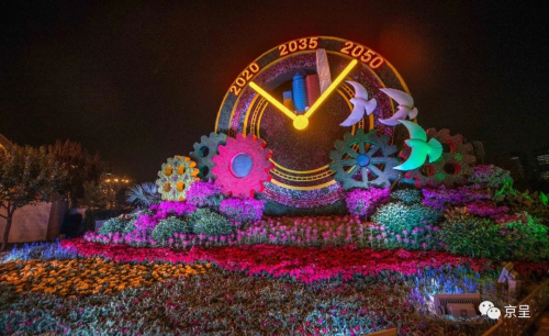 ▲“美好明天”花坛,以全面建成现代化强国的两个阶段为题材,谱写全面建设富强民主文明和谐美丽的社会主义现代化强国的壮丽篇章。