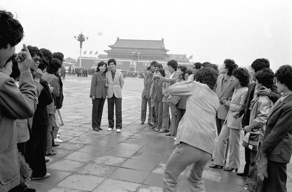 1987年5月1日,辽宁省丹东汽车制造厂23对新婚夫妇在北京天安门广场冒着蒙蒙细雨拍照留念。他们是在厂里参加集体婚礼后来北京旅游的,旅游结婚开始在当时的年轻人中流行。新华社发