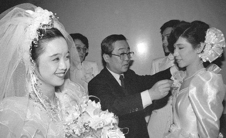 1988年2月6日,专门从事婚礼照相的中日合资照相馆总经理高崎纪一郎(中)在北京民族文化宫为参加集体婚礼的新娘整理服装。新华社发