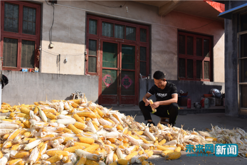 杨其戴在自家院子里帮父母掰玉米。未来网 杨佩颖摄