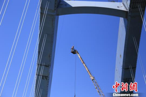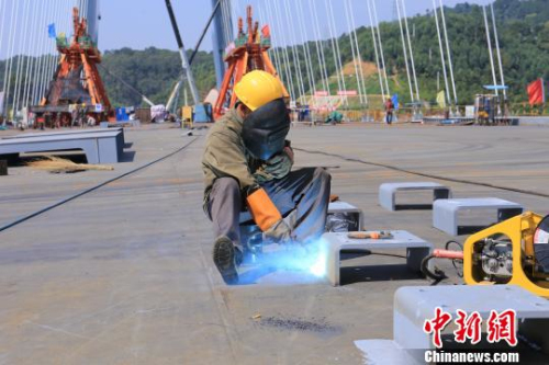 在官塘大桥项目现场,不少工人正在紧张有序地给合龙两端的钢箱梁焊缝进行焊接,更有作业人员站在高空施工平台上由吊车吊起,在距江面100多米的高空对拱面进行作业。