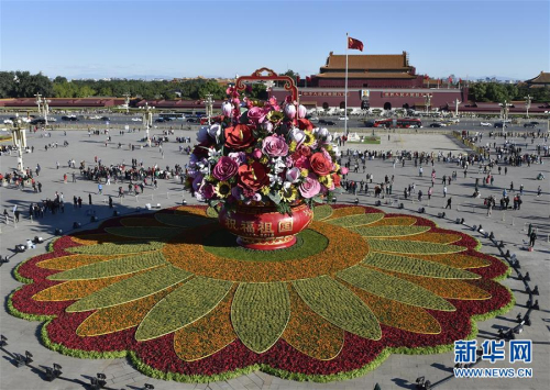 连日来,在天安门广场的中央,一个直径50米、簇拥着17米高大型花篮的巨型花坛格外引人注目,成为八方游客争相合影留念的最佳背景之一。