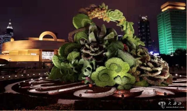 立体绿雕的荷花与荷叶,洒落点点水珠,营造荷塘胜景的意境,表达合作共赢的愿望。在上海的陆家嘴金融城,以进口博览会为主题的大型花坛“珠联璧荷”,成为众多游客拍照留念的背景。