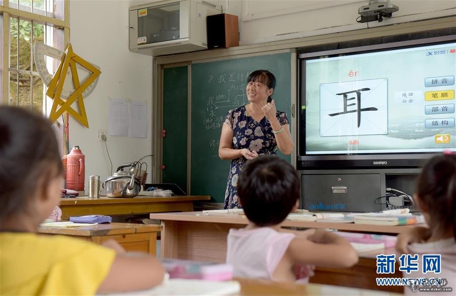 在安徽省黄山市黄山区乌石镇清溪中心小学茶儿垅村教学点内,蒋秀兰老师在给孩子们上语文课(9月7日摄)。今年53岁蒋秀兰老师从1983年参加工作开始,一直独自坚守在“一人一校”的单班教学点,最多的时候独自一人带过26名学生,目前她负责两个年级5个孩子7门课的教学。新华社记者王正忠摄