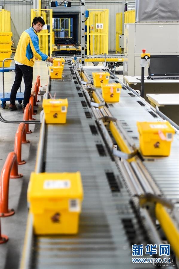 在江苏南京苏宁云仓物流基地,工作人员将包装好的“共享快递盒”放到传送带上,准备进行分拣运输(2017年10月31日摄)。新华社记者李博摄