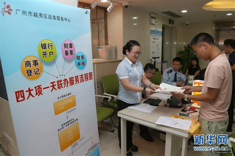 7月19日,“四大项一天联办服务专窗”在广州市越秀区政务服务中心亮相,工作人员将营业执照递交给申请者。新华社记者张加扬摄