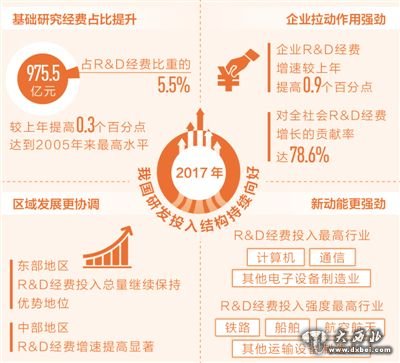 综合看,2017年,我国规模以上工业企业中R&D经费投入超过500亿元的行业大类有8个,合计7828.9亿元,比上年增长10.7%,增速高于规模以上工业企业0.9个百分点;这8个行业的R&D经费占规模以上工业企业的65.2%,较上年提高0.6个百分点。