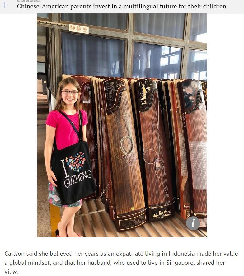 卡尔森在明尼苏达州做销售工作。她说,“女儿的中文流畅了许多,之前她的中文已经很不错了,不过自从每天有人跟她用中文聊天,她的水平更高了。”