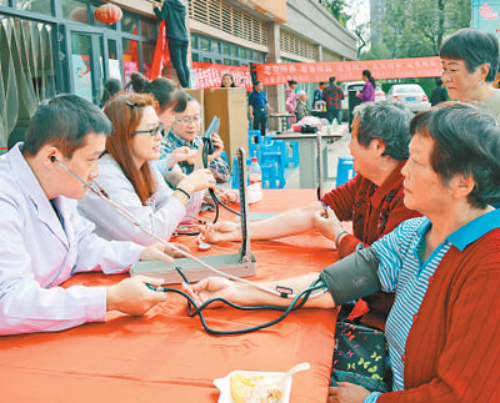 10月15日,四川成都市青羊区汪家拐街道长城社区举行义诊等孝老爱亲活动,近百名老人参加。