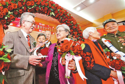10月15日,中国航天科工集团退休干部王兴甫老人(左一)向妻子王崴赠送航天器模型。当天,北京市丰台区云岗街道举行“重阳敬老庆金婚 共享幸福邻里情”金婚、钻石婚庆典活动。