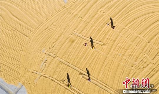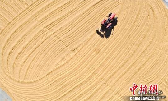 又是一年丰收季。图为航拍位于祁连山下的谷子丰收景象。王将摄