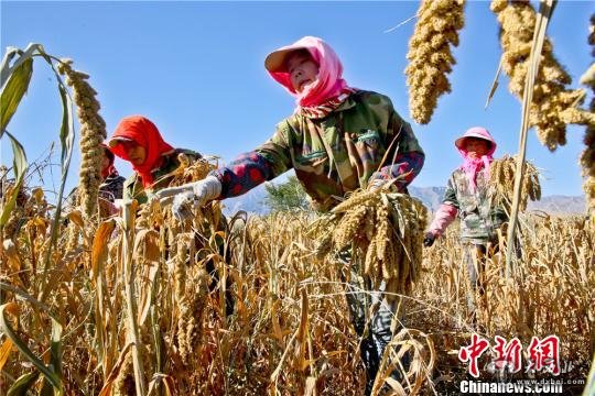 位于祁连山下张掖市甘州区花寨小米种植专业合作社的农户,收割成熟的绿色有机无公害谷子。王将摄
