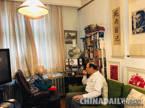 伊莎白的家堪称一个小型中国博物馆,柯马凯扶着母亲伊莎白坐在平日里经常坐的一张方形餐桌边,身后的墙上挂着“四海翻腾云水怒”、“五洲震荡风雷激”的楹联,楹联中间是1949年北京解放时的毛泽东画像,紧挨着这堵墙挂着的则是柯马凯父亲、著名国际友人柯鲁克的画像。