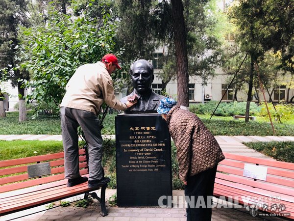 最后,我们与柯马凯一同来到位于北京外国语大学东校区戴维·柯鲁克的塑像前,祭奠他的父亲、中国人民的好朋友。柯马凯告诉记者,父亲捐赠了遗体,他和母亲也已经签署了“遗体捐赠协议”,希望将这一传统沿袭下去。