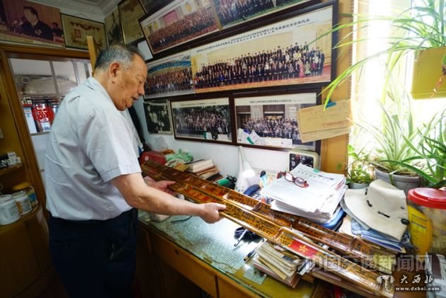 除了陈旧的家具外,房间里最多的就是书。“退休以后,我经常看看书,写点客运服务的心得体会。”杨怀远指着书架、桌子上的书籍,乐呵呵地说。书房墙壁上挂着一幅幅革命先辈的画像、题词,以及他昔日挑扁担英姿勃发的工作照。