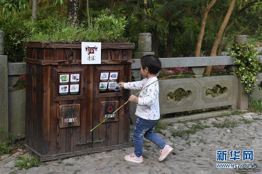 在浙江省衢州江山市石门镇清漾村,小朋友将垃圾分类放入垃圾箱内(4月20日摄)。新华社记者 黄宗治 摄