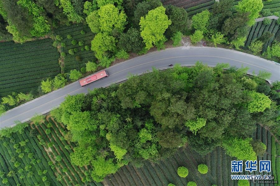 汽车在贵州省遵义市湄潭县金花村内的道路上行驶(4月12日无人机拍摄)。 新华社记者 欧东衢 摄