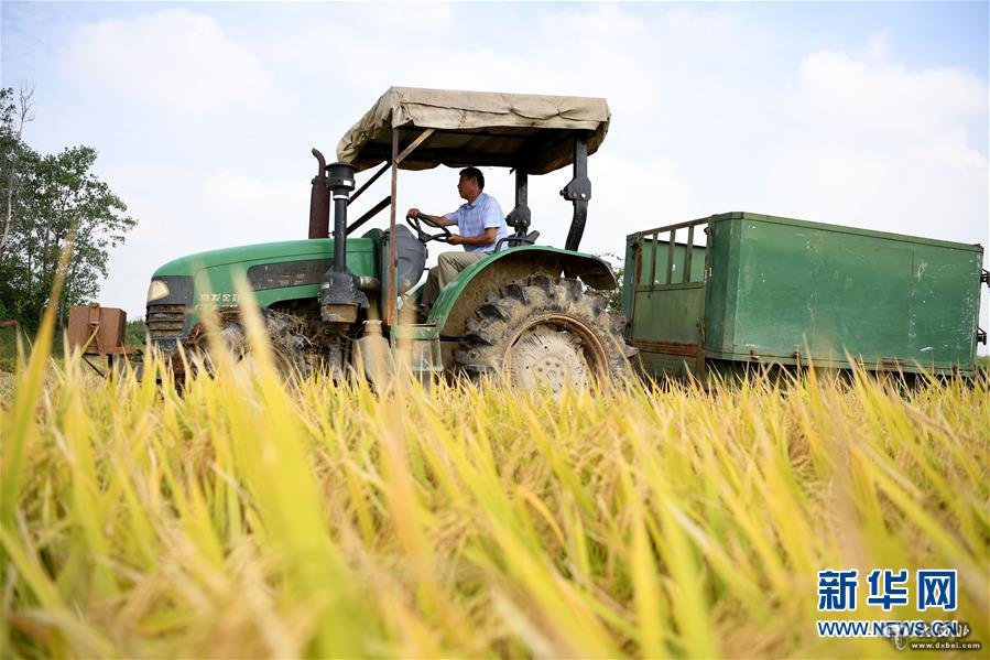 安徽省肥西县山南镇小井庄村种粮大户陈良玉驾驶拖拉机运送刚收割的水稻(9月12日摄)。 新华社记者 刘军喜 摄