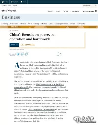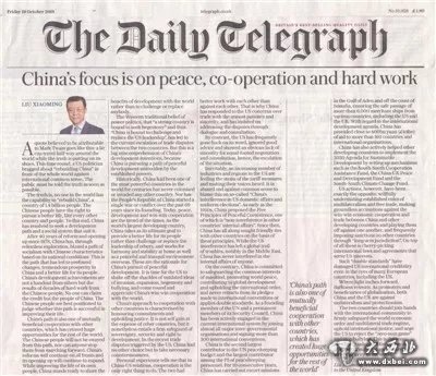 2018年10月19日,英国主流大报《每日电讯报》纸质版和网络版同时刊登驻英国大使刘晓明题为《中国致力于和平、合作与奋斗》的署名文章。全文如下: