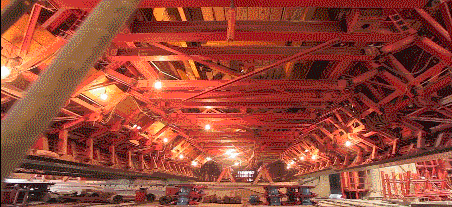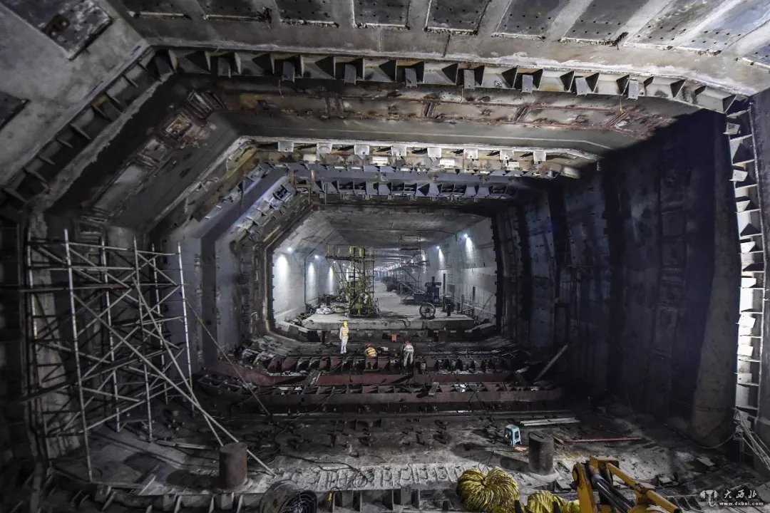 2017年7月7日,港珠澳大桥海底隧道正式贯通。图为施工人员在港珠澳大桥海底隧道最终接头处施工。