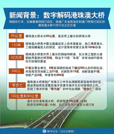 港珠澳大桥被英国《卫报》誉为“新世界七大奇迹”之一。有人评价,它是交通工程界的“珠穆朗玛峰”.对于这座目前世界上综合难度最大的跨海大桥而言,每项荣誉的背后,都是一组组沉甸甸数据的支撑。