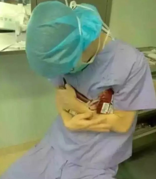 为了尽快给守护台上的患者输血,医生将两袋只有4度的血细胞抱在怀里。嘴里直念叨:“快点升温,快点升温,救命呢。”