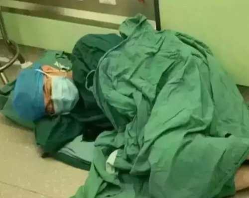 一天完成了18台手术的他,太累了,直接在地上睡着了。他曾经被查出胃癌,手术后化疗一结束,在化疗反应还没完全消失的情况下,他又重新站在了手术台上。