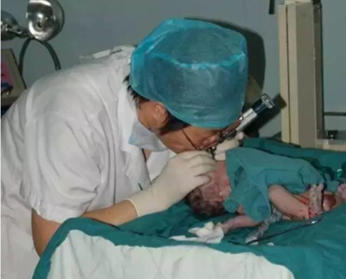 一个胎盘早剥的新生儿,误吸羊水和粪便导致窒息,麻醉师用双唇通过气管插管将患儿气管内的误吸物吸出,患儿得以抢救成功。