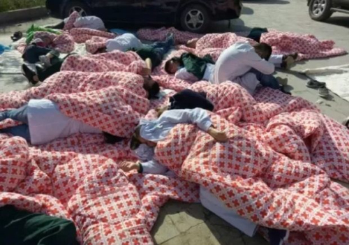 九寨沟地震发生后,医生们在医院大门外的坝子头搭起临时手术台,抢救伤者。忙碌一宿的医护人员,席地而睡,短暂休息,很快又将投入新一轮的救援。