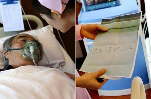 13名医护人员6个小时奋力抢救,终于把老人从死亡线上拉了回来。老人苏醒后,用手指在嘴边挨了挨,护士询问是否不适,老人摇摇头,指了指护士手中的护理记录单,看了看笔。