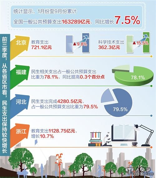 从各省区市看,民生支出保持较快增长。比如,前三季度,北京市教育支出721.1亿元,同比增长9.8%;科学技术支出362.3亿元,同比增长15.5%;医疗卫生与计划生育支出369.8亿元,同比增长17.3%。