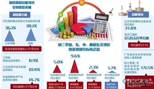 在政策的带动下,前三季度,东、中、西和东北地区投资增速均有所企稳。其中,东部地区投资同比增长5.8%,增速比前8个月提高0.1个百分点;中部地区投资增长9.6%,增速提高0.4个百分点;西部地区投资增长2.3%,增速提高0.1个百分点;东北地区投资增长1.7%,增速与前8个月持平。