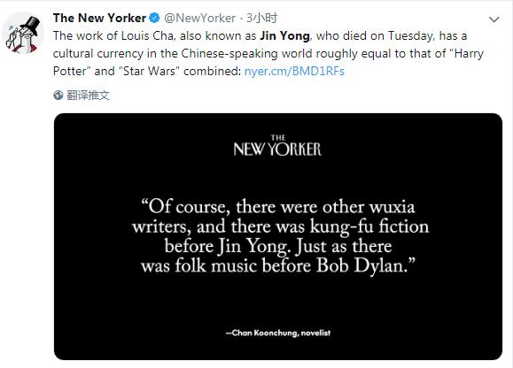 金庸去世后,美国《纽约客》杂志在其官方推特上悼念金庸,并转发了该杂志在4月份刊发的一篇关于金庸的文章。这篇文章介绍称,金庸在中国的文化价值,大约相当于《哈利·波特》加《星球大战》在西方的地位。在武侠题材领域,金庸被广泛视为是最优秀的作家。“当然也有其他武侠作家,金庸之前也有功夫小说,就像鲍勃·迪伦之前也有民谣音乐一样。”文章援引香港作家陈冠中的话称。