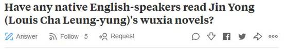 在美国问答类网站“Quora”上,关于金庸及其小说的提问有十多条。其中一个提问是,“在西方有人喜欢金庸的功夫小说吗?”一名曾在中国学过的中文的外国网友“ImreKovacs”答道:“我几年前看过倚天屠龙记电影。我非常喜欢它。事实上,我最早知道的一些普通话词汇就是从香港邵氏电影拍的武侠电影中学的,例如‘岂有此理’、‘后会有期’、‘不必多礼’、‘阁下’、‘少爷’等。”另一名网友“JayBo”在回答关于“有没有以英语为母语的人读过金庸”的问题时说:“是的。事实上,我运行了一个小网站,你可以下载由书迷们翻译的金庸作品的免费英文版。”