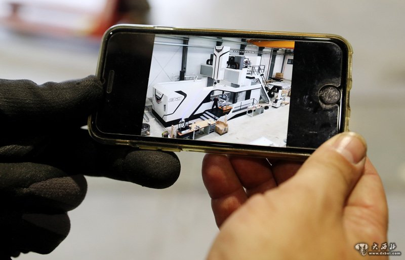 德国工程师马丁·霍尔茨海德在安装现场用手机展示“金牛座”龙门铣床安装完成后的效果图