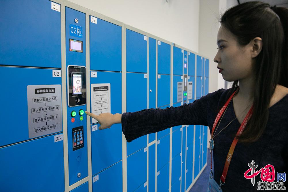 上会记者刷脸存储个人物品。储物柜采用“人脸识别”技术,不仅降低了储物柜的误开率,还提高了安全性。中国网记者董宁摄