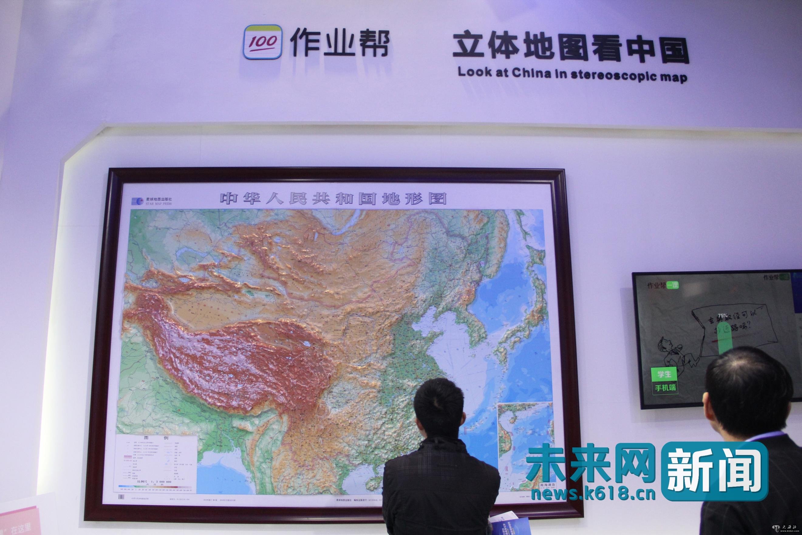 在数字与文化教育展区的作业帮展台,一张悬挂在墙上的立体三维的中国地图,吸引了众多观众。这张地图清晰的展现了中国国土的地理环境,五彩的颜色代表不同的地势,凸凹不平的表面显示着不同地区的海拔,前来参观的学生兴奋的用手抚摸着,有学生感慨道,“看了这个地图,就知道玄奘西天取经有多难了。”