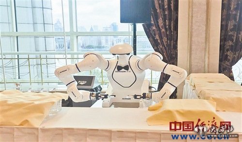 中科新松的双臂协作机器人,可以为嘉宾提供倒茶等服务。 经济日报-中国经济网记者 沈则瑾摄