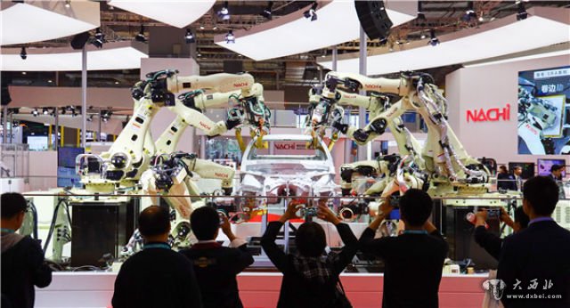 11月5日,日本那智不二越公司展出的点焊密集协作机器人在进行作业演示。新华社记者刘大伟摄