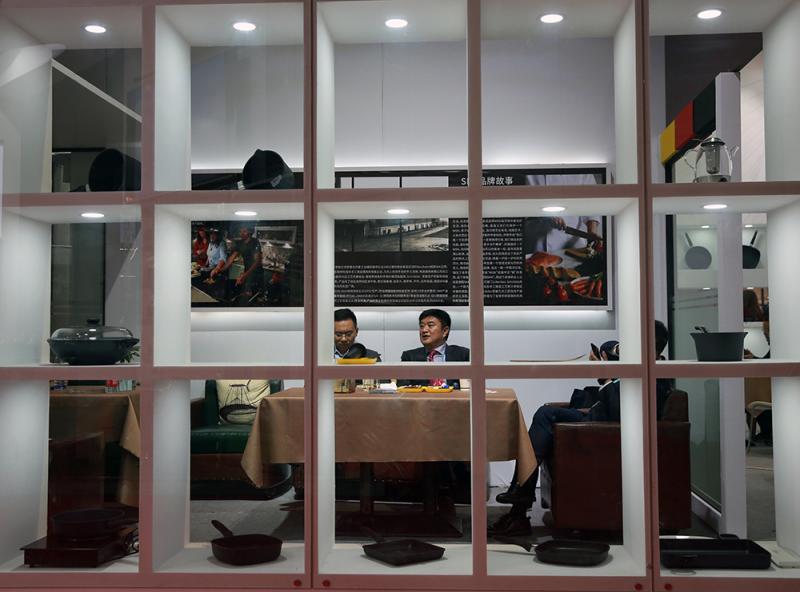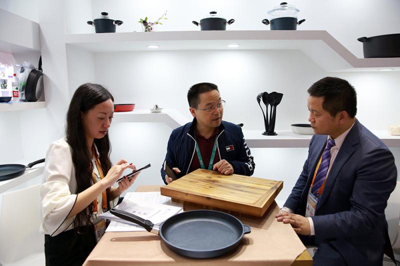 SKK锅具亚洲总代理人赵天平基本全天处于谈生意状态,他深感中国消费升级带来的市场机遇,于是报名第二届进博会,打算以后每届都不缺席。